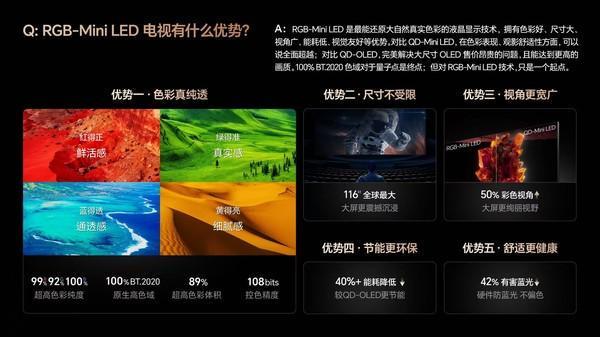 傳統Mini LED使用藍色LED芯片搭配量子點材料或熒光粉實現白光,而海信RGB-Mini LED首次在單顆燈珠內集成紅、綠、藍三原色發光芯片,實現了從光源起點的色彩直出。這種設計的核心優勢在于從根本上提升了色彩純度。