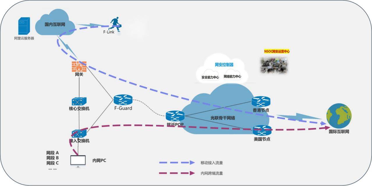 在安全與接入層面,移動辦公終端通過F-Link零信任網關安全接入企業內網,確保遠程員工身份可信、訪問可控。F-Guard安全融合網關可實時識別潛在的內網威脅,配合光聯NSOC安全運營中心的7×24小時監測與告警機制,主動防御入侵與病毒攻擊,實現從檢測到處置的全生命周期防護。
