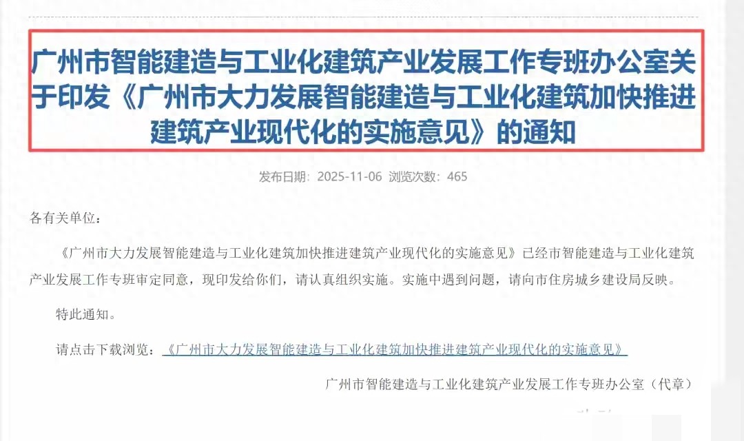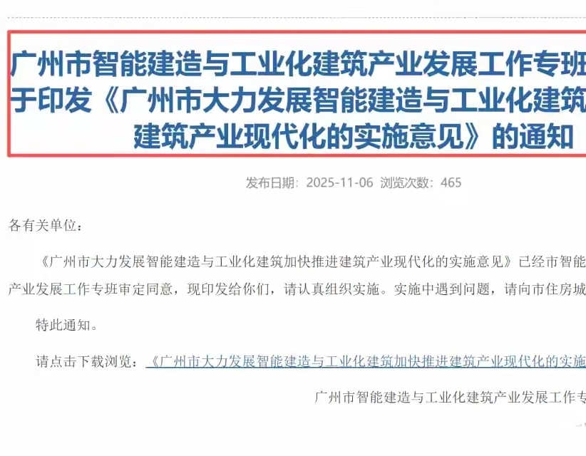 這事兒的核心來自廣州市住建局2025年6月發(fā)布的《關(guān)于大力發(fā)展智能建造與工業(yè)化建筑加快建設(shè)建筑業(yè)現(xiàn)代產(chǎn)業(yè)的實施意見(征求意見稿)》,明確劃定硬要求:2026年起,全市出讓的居住用地必須100%實施裝配式建筑 。簡單說,以后廣州蓋房子就像拼高達(dá),墻板、樓梯、整體衛(wèi)浴全在工廠預(yù)制完成,運到工地直接吊裝拼裝,“咔咔”幾下就能搭起樓棟框架。