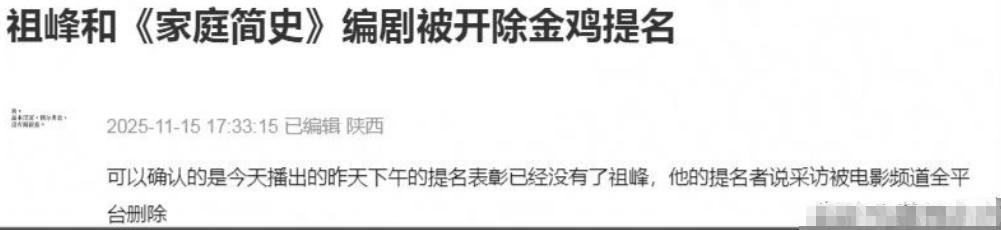 而是他參演的《家庭簡史》整個作品提名全部被開除,編劇同樣跟祖峰一樣消失,就連相關采訪都被緊急下架。