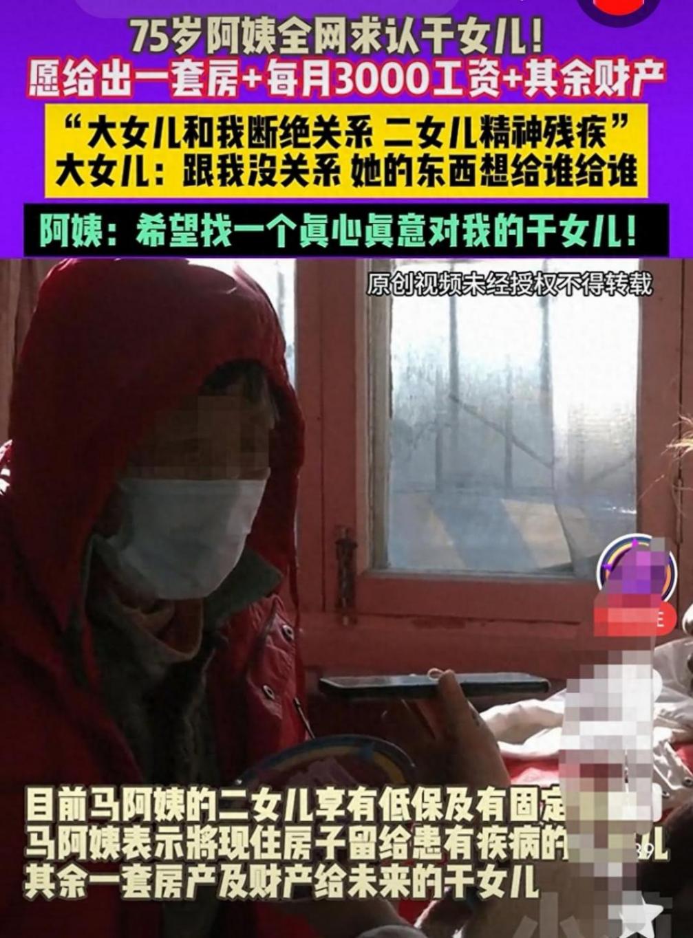 原來阿姨老伴去世的早,膝下有兩個女兒,大女兒前幾年斷絕了與她的關(guān)系,至于什么原因,他也沒有過多的透露,而二女兒精神有問題,生活不能自理,為了防老,所以在網(wǎng)上發(fā)布了認(rèn)干女兒的通告。
