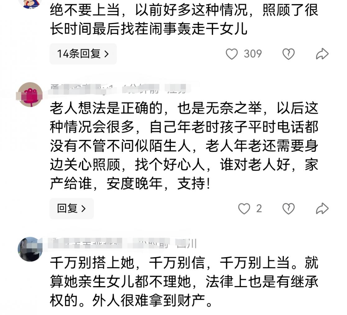 也有的說老人的想法是正確的,這個選擇也是老人的無奈之舉,等自己老了的時候,身邊沒有人照顧,能夠找到一個好心人照顧她安享晚年,誰對她好?老人自然會答應(yīng)自己的承諾。