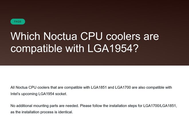 11 月 27 日消息,Noctua 貓頭鷹在其官網的 FAQ 頁面表示,所有兼容英特爾 LGA1851 和 LGA1700 插槽的貓頭鷹處理器散熱器,同樣也支持英特爾即將推出的 LGA1954 平臺。