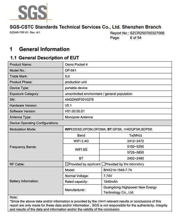 FCC 數據庫明確標注了 Osmo Pocket 4 的電池參數。文件顯示,該機搭載了一塊額定容量為 1545 mAh 的電池,電壓維持在 7.7 V。與前代產品 Osmo Pocket 3 內置的 1300 mAh 電池相比,這一基礎物理容量的提升幅度已達到 18%。