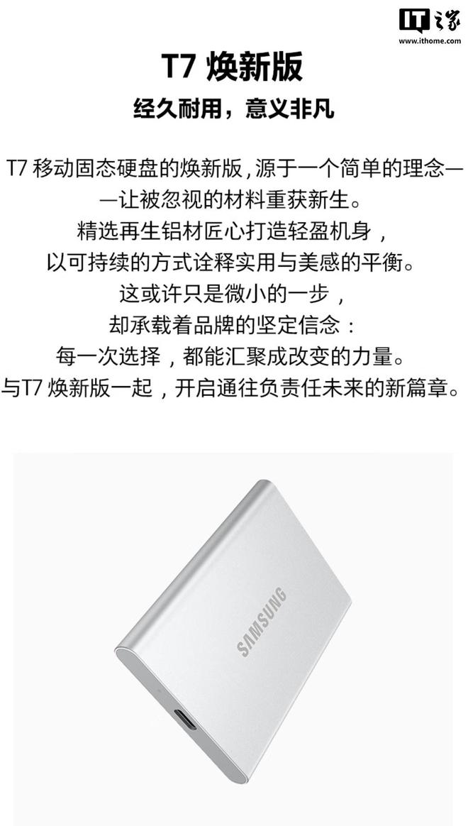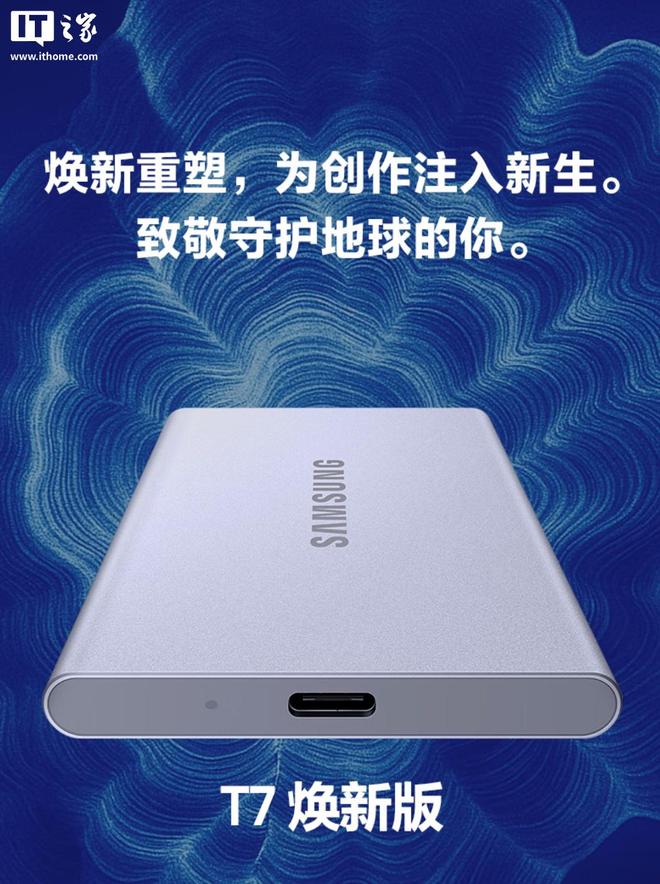 11 月 30 日消息,三星 T7 煥新版移動固態硬盤現已在京東平臺開啟新品預約,讀取速度最高可達 1050MB/s,兼容手機、電腦、游戲機等設備,有 1TB、2TB 和 4TB 版本可選,售價 999 元起。