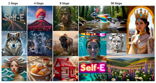 近日,香港大學(The University of Hong Kong)與 Adobe Research 聯(lián)合發(fā)布 Self-E(Self-Evaluating Model):一種無需預訓練教師蒸餾、從零開始訓練的任意步數(shù)文生圖框架。其目標非常直接:讓同一個模型在極少步數(shù)也能生成語義清晰、結(jié)構(gòu)穩(wěn)定的圖像,同時在 50 步等常規(guī)設(shè)置下保持頂級質(zhì)量,并且隨著步數(shù)增加呈現(xiàn)單調(diào)提升。
